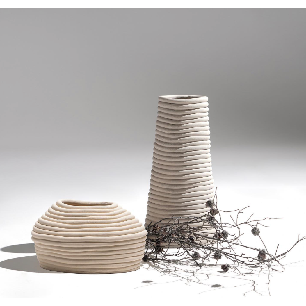 This collection is embodied by one-of-a-kind pieces. Each piece is created by hand shaping method and high-fired in stoneware clay.
